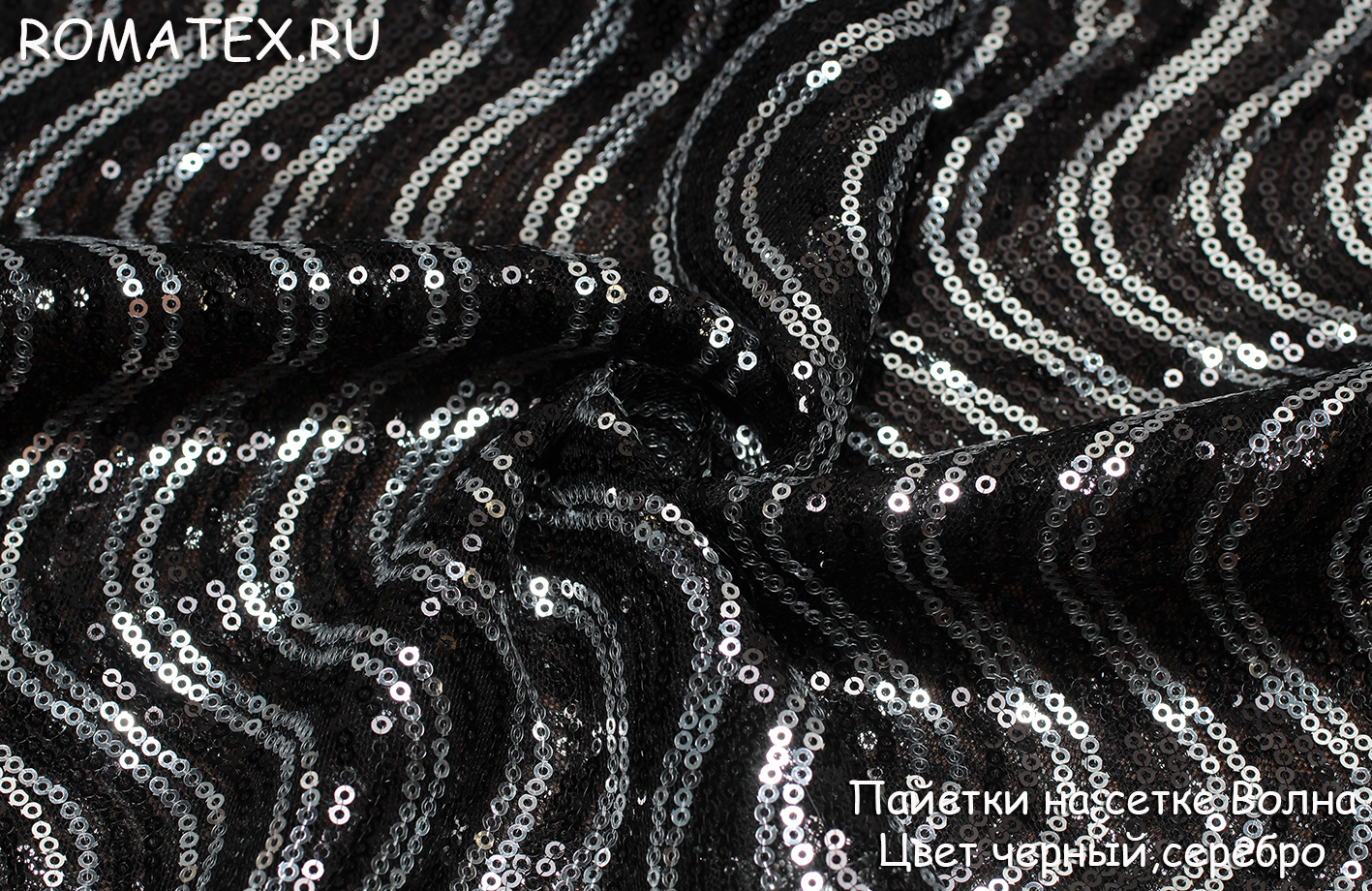 Ткань пайетки на сетке волна цвет черный, серебро